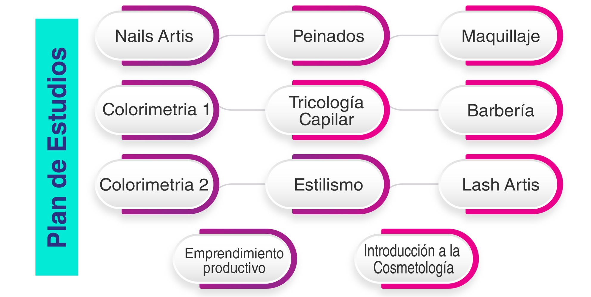 Módulo de Nail Artist, Peinados, Moños, Trenzas, Recogidos y Cepillados para toda ocasión - Cambios estructurales como Alisado con queratina, permanentes, botox y mucho más. Cortes de Cabello profesional para damas y caballeros, 0 grados, 90 grados, 180 grados. Maquillaje desde 0 y técnicas avanzadas, cejas perfectas, colocaión de pestañas, contornos, maquillaje para eventos, delineado y visajismo. Especialízate en colorímetria, aprende a realizar bases, mechas, marmoleados, balayage áy ms tendencias.